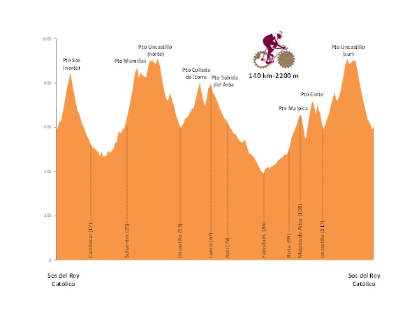 La Rompepiernas celebra su quinta edición el sábado 7 de mayo. Esta marcha cicloturista impulsada por el Club Val d’Onsella tiene como centro neurálgico la villa medieval de Sos del Rey Católico (Zaragoza) y transcurre en su mayor parte por la zona de las Altas Cinco Villas: Sos del Rey Católico, Navardún, Urriés, Undués de Lerda, Castiliscar Malpica de Arba, Biota, Farasdués, Asín, Luesia y Uncastillo.