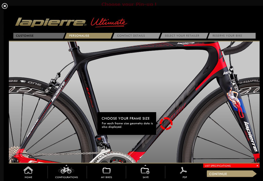 Una vez elegido el cuadro, que está disponible en tres decoraciones (réplica FDJ, negro/rojo y azul/negro/amarillo), el configurador Lapierre Ultimate te permite escoger sus principales componentes: grupo, ruedas, manillar, potencia, tija, sillín y horquilla. Respecto a este último elemento, esta temporada 2014 Lapierre ha incluido la opción de decoración con las exclusivas chicas pin-up Aurélie, Nicole y Audrey en algunas de las horquillas, que harán que tu bici tenga una imagen fuera de lo habitual.